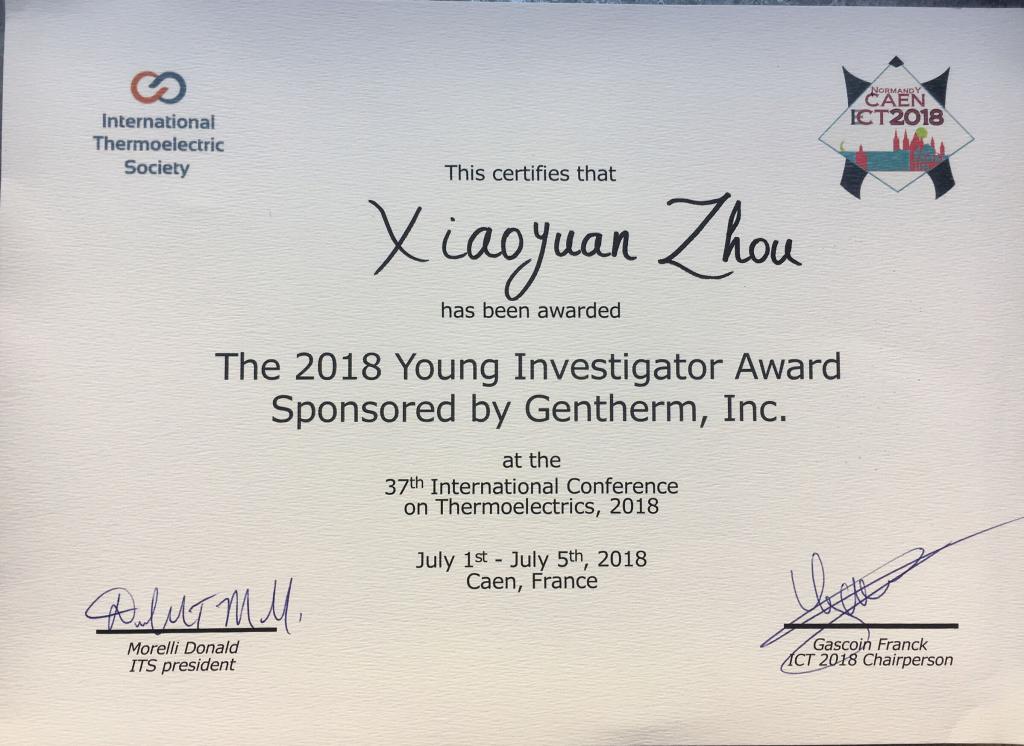 在2018年7月1日至4日于法国诺曼底召开的第37届国际热电大会上,国际热电学会(International Thermoelectric Society)将本年度青年科学家奖(Young Investigator Award)颁发给我校分析测试中心主任周小元研究员。